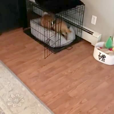 A man asks his dog if he wants to go for a walk, and the dog comes out of his crate. The man then asks if he wants to take a bath, and the dog goes back into the crate.
