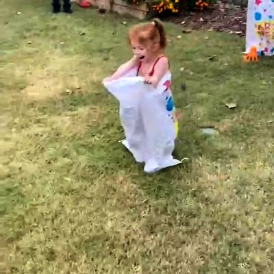 A tot girl and a young boy race in potato sacks and once the boy pulls ahead she retreats inside of her bag and people laugh in the backyard.