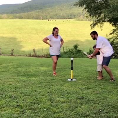 A man hits a ball for a gender reveal and hits his pregnant wife in the face.
