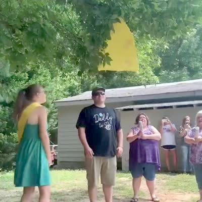 A father and his young daughter try to pop a smoke cannister for a gender reveal and it malfunctions and shoots the man in the face with blue powder.