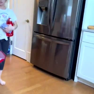 A man tells a young girl that there is a mouse in a kitchen drawer and she holds a bag to help catch it. He opens the drawer and reveals a computer mouse. She giggles and hits him with the bag. Computer Mouse In the House Challenge