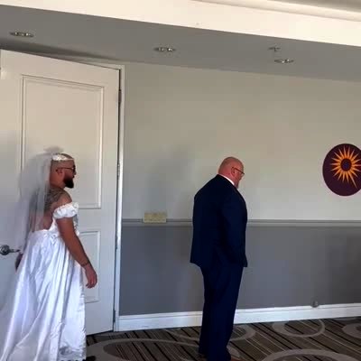 A man stands with his back to the door awaiting his bride and his adult son enters the room in a wedding-dress instead. The groom is amused and they laugh and pose for pictures.