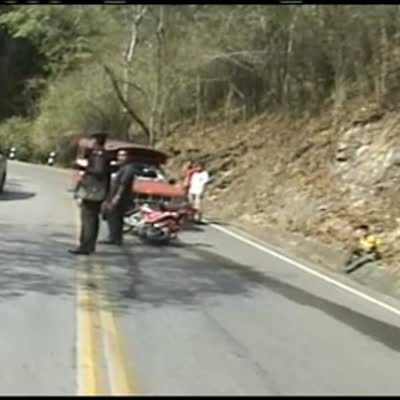 Man rides motorcycle & videotapes at same time. He & another rider pass a bike accident, other man rides his bike into a ditch seconds later. Crash. Happens in Thailand.