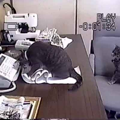 2 CATS ON TOP OF DESK RIFLE THROUGH PAPERS AS THEY COME OUT OF FAX MACHINE