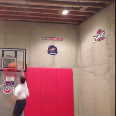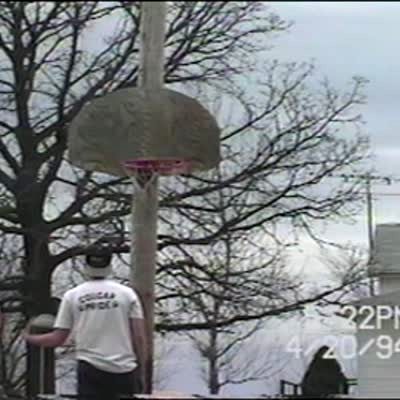 Guy hangs from basketball rim, it breaks, he falls
