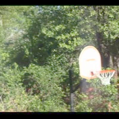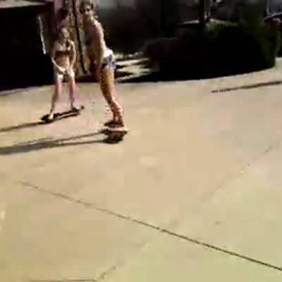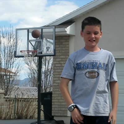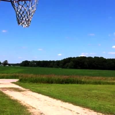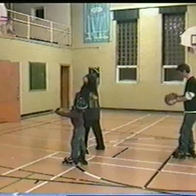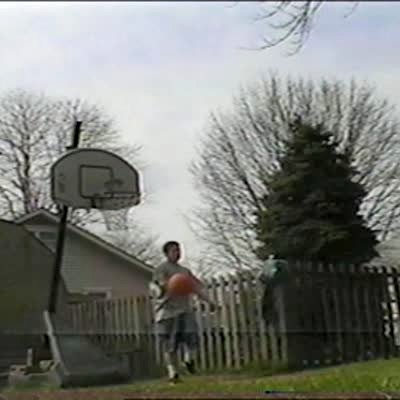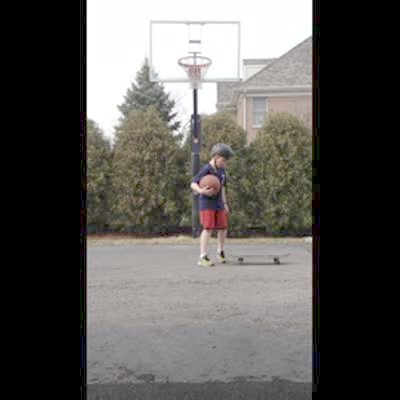 Start at 1:53. A teen girl dunks a basketball and swings back on the rim, knocking her friend off of a scooter.