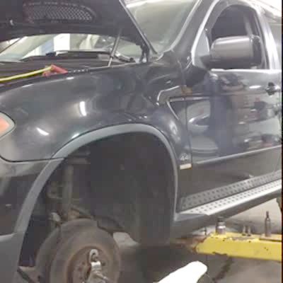 A mechanic pulls off a tire rim and falls backward and hits the camera.