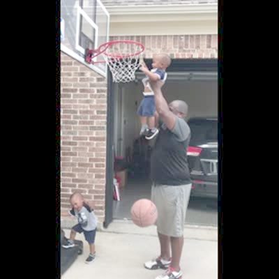 A man holds a tot boy up to dunk a basketball into a hoop in the driveway and the ball goes through and then comes down and hits his twin brother in the head.