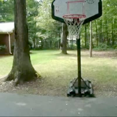 A man jumps and touches the basketball rim in the driveway but then the entire backboard tips over and falls on him. Security footage.
