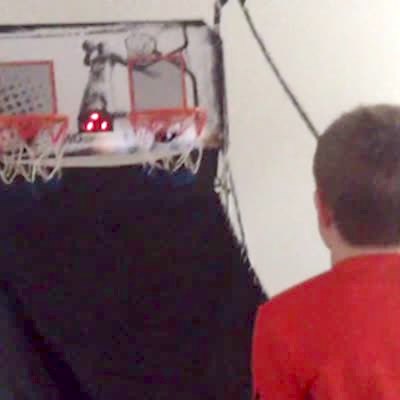 A boy flips a water bottle onto a toy basketball hoop in the living room and it lands on the rim.
