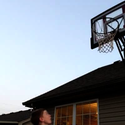 Teen girl shoots a basketball from the back steps of the house. The ball gets stuck between the hoop rim and the backboard
