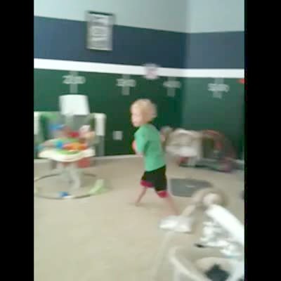 A tot boy runs around a living room and dunks a toy basketball into a toy basketball hoop. He runs away from the hoop, it topples, and falls down on top of the boy, trapping him in the rim and basket. Caucasian.