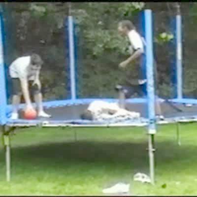 A boy uses a trampoline to elevate to dunk a basketball in a hoop. When he hangs on the rim the entire hoop comes crashing down, pinning him to the ground. Surveillance footage. Screen recording.