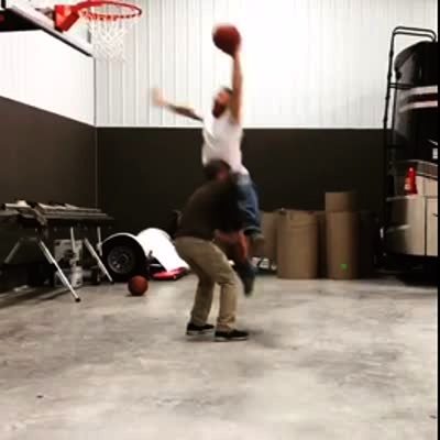 Man throws basketball at rim and it bounces off and hits tot in head.