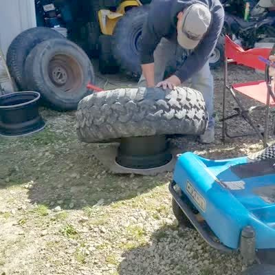 A man jumps on a tire and falls backwards as he tries to put the tire onto a rim in a front yard.