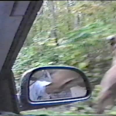 Man sleeping in car is awakened by driver who screams "oh shit." Man is scared & hits the camera when he realizes it's a practical joke. Thought it was a car accident.