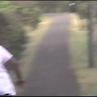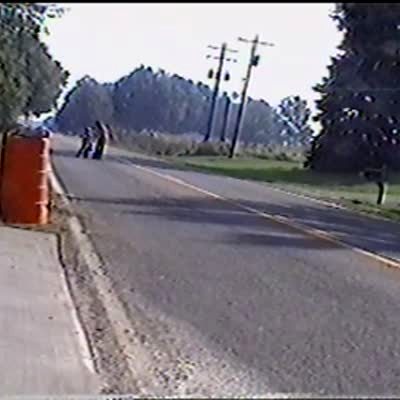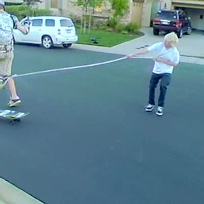Man on rollerblades wearing only US flag shorts gets towed by a truck in the street, he trips and crashes hard. Gets road rash. Long for edit. Bonehead.