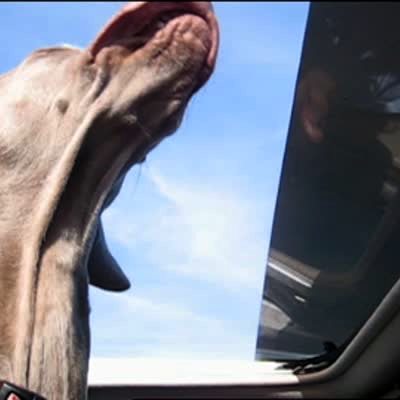 Chocolate lab dog sticks its face out of a car sun roof and its lips flap in the wind. Funny face / visual.