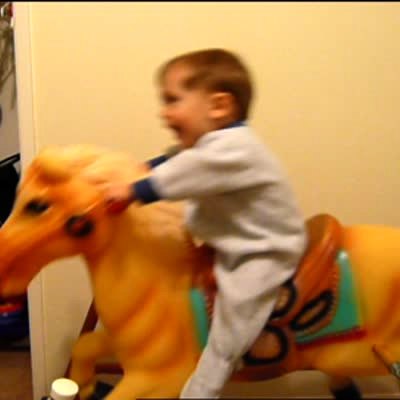 A tot boy says, "Yeehaw" and falls off a rocking horse at home.