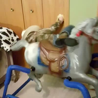 A young girl rides a rocking horse and repeatedly says "I gotta slow down, Poppy slow down," but she does not slow down and eventually she just falls off.