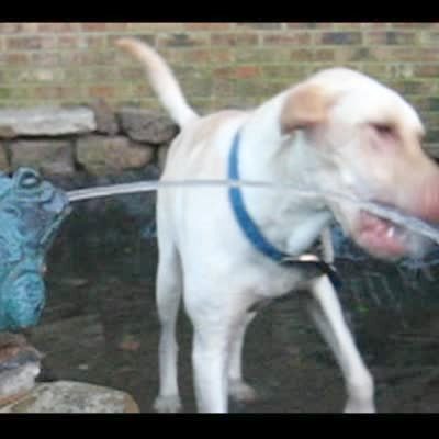 Dog stands in a rock pond and drinks the water out of a frog statue fountain's mouth