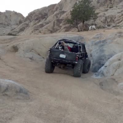Several adults ride in a four wheel truck on rocky and sandy terrain when they try to drive over a rock and a woman falls out of the truck. No tails Very dangerous and scary.