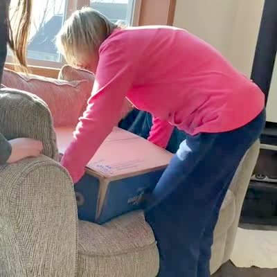A woman opens a box on the couch, says "It's heavy, is it rocks?" and as she pulls the tape off a young girl explodes out of the box and she screams and runs away in the living room.