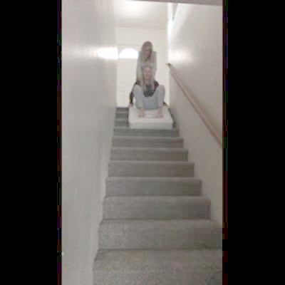 A teen girl pushes her friend down the stairs on a mattress but trips and falls over her and rolls down the steps