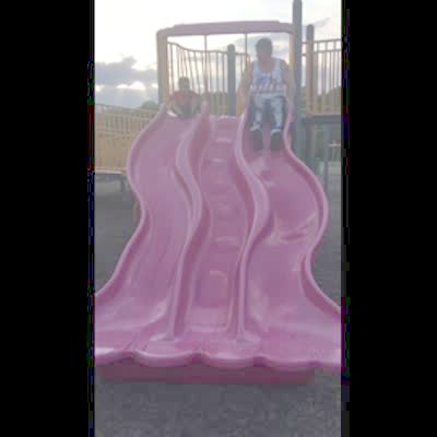 A senior woman and a tot boy ride down ride down on separate slides that are next to each other on a playground outdoors. The boy loses control as he goes down and rolls over the edge onto the other slide between him and his grandma and she catches him before he gets hurt.