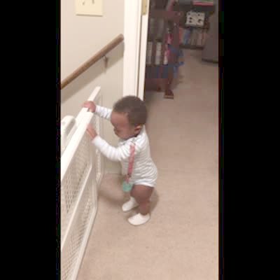 A tot boy takes rolls of toilet paper out of a closet and throws them over a baby gate and down a flight of stairs.