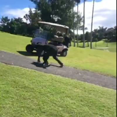 A teen girl drives a golf cart while another teen girl rides on the back when they flip the cart over and fly out. They proceed to get up and roll the cart over upright.