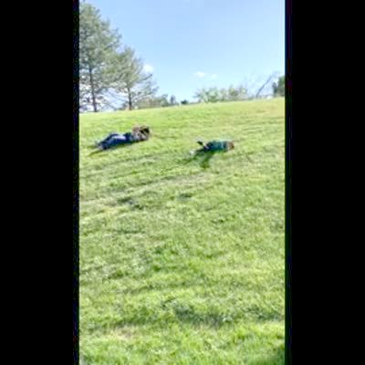 A tot girl walks up a grassy hill outside before she is run over by a young girl rolling down the hill.