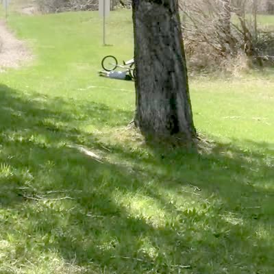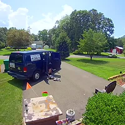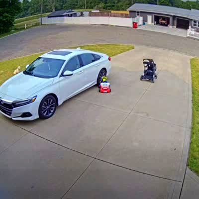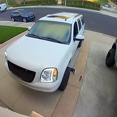 A woman driving an SUV accidentally backs up over a bicycle lying in the driveway. She exits the vehicle to investigate but fails to put the car in park, causing it to roll backwards into the street and hitting a parked car at a neighbor's house. Security footage.