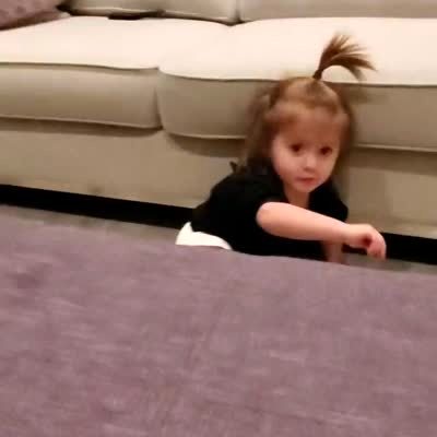 A tot girl pets a dog who then rolls over and falls off an ottoman footrest and rolls onto the girl who then falls down on the living room floor.