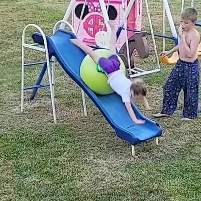 A tot girl tries to roll down a slide on a ball, but she flips over it and hits her face on the bottom of the slide.