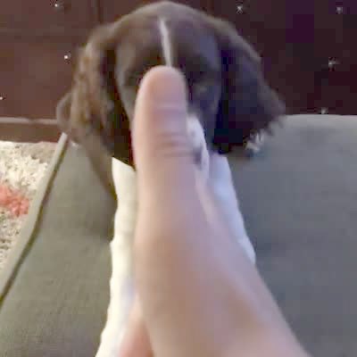 A woman with the camera pretends to shoot a dog with her finger and the dog rolls over on a living room cushion and slips and falls off.