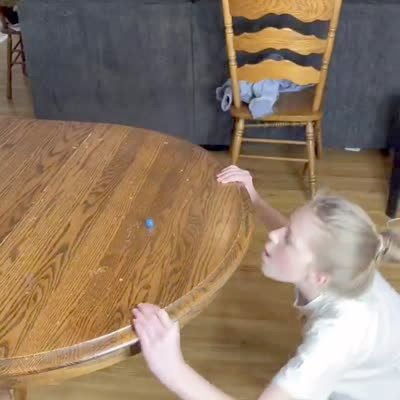 Young men and women take turns rolling M&M Candy across a table, then running over and diving down to try and catch it in their mouths.