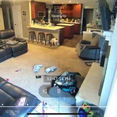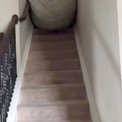 A dog that lays near the top of the steps rolls over in his sleep and falls down the steps into the basement (the dog was okay). Security footage.