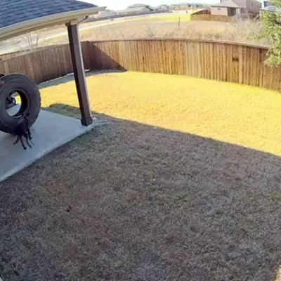 A man rolls a large tire into the backyard. He slips and falls but the wheel rolls on. He gets up quickly to stop it before it hits the fence, but it hits the fence and he falls over again. The tire falls next to him and he yells, "Man down!" Security footage.