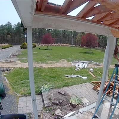 A man stands on a ladder and uses a chainsaw to saw off part of a porch roof/awning. The wood beam the man cuts hits his ladder, he falls, flips and rolls off the porch with his legs bent over the back of his head. Security camera.