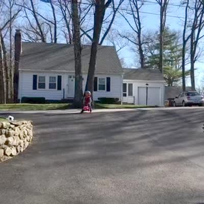 A young girl rolls down a driveway in a stroller then flips over when she hits a fence across the street while her grandma tries to catch up with her. Security footage.