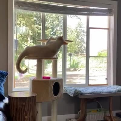 A cat lies on a pet tower and paws at a ball, then rolls over and falls in the living room.