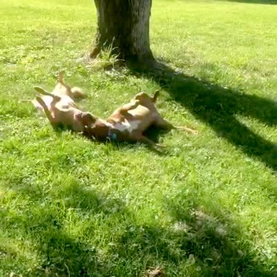 Two dogs roll over in unison as a woman laughs outdoors. Social media video.