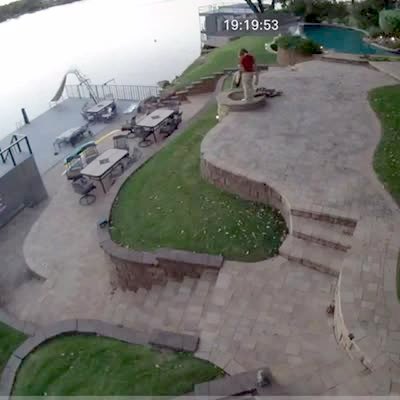 A man walks down the porch steps heading towards a nearby lake. He slips and falls onto his backside and drops the cup of hot coffee he's carrying on his legs in the process. He rolls around in pain in the grass while cursing. Security footage.