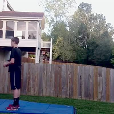 A young boy tries to do a standing-back flip but lands on his head in the backyard and rolls over and groans.