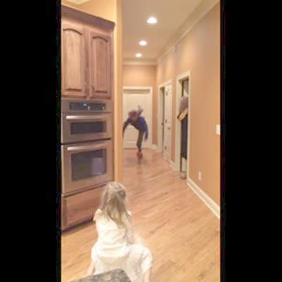 A man tries to balance on one roller skate at home and his foot slips out from under him. He falls and hits the floor with his face. A Girl laughs.