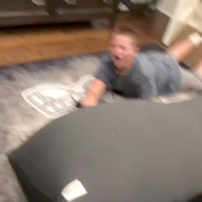 Teen boy using Ab Roller on hardwood floor slides the exercise equipment right into his stomach groin. Bonehead.