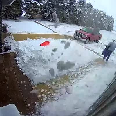 Two adults shovel their driveway in front of their home then moments later a bunch of snow falls off roof onto driveway. Security footage.