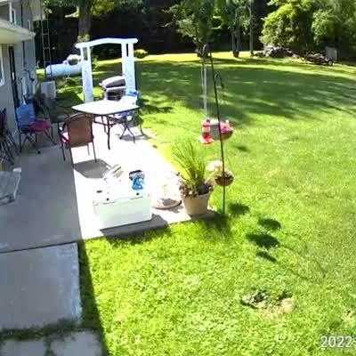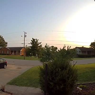 As a woman walks down her driveway, she sees a trampoline float through the air and fall onto a neighbor's roof. Security Footage.