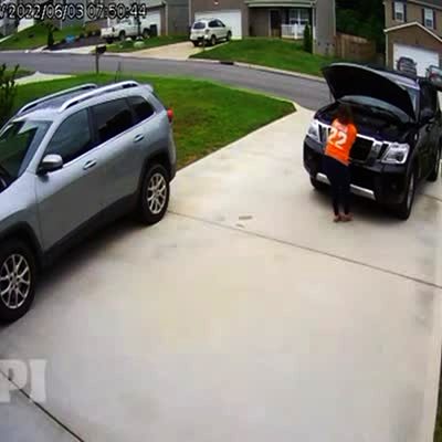"Can't Stop in Flip Flops" A vehicle rolls back into the street as a woman struggles to hold it back. Then, in a neighbor's security camera video, the car is seen hitting the mailbox across the street. Security footage. No Audio.